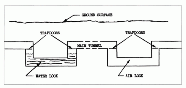 Đường hầm với những cửa lọc khí và cửa lọc nước, ngăn chất độc hóa học.