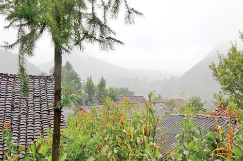 Con đường dẫn vào bản nhỏ xíu thoai thoải dốc như bị che khuất bởi những ruộng ngô, Lô Lô Chải hiện ra với những căn nhà trình tường lợp ngói âm dương ba gian đã trải qua hàng trăm năm tuổi.