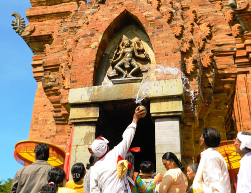![]() Sau khi cúng tế, ông Camnai làm nghi thức té nước thần Shiva trước cửa tháp, ông cầm lọ nước cát lồi được hóa phép làm nghi thức té nước. Các tín đồ ở dưới sẽ hứng những giọt nước thiêng thoa lên cơ thể nhằm cầu may mắn và bình an. |