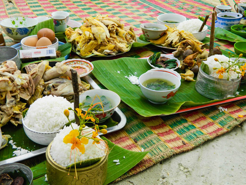 ![]() Cơm dâng cho thần linh luôn được vo tròn trong chén thánh và trầu cau là lễ vật không thể thiếu. |
