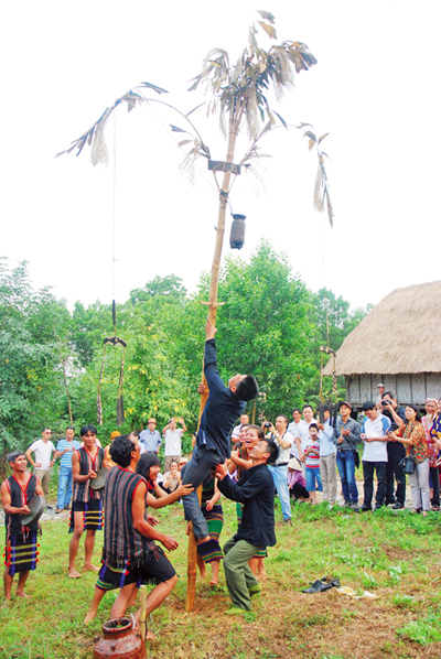 Đội chiêng đánh bài “vào hội”, đội múa nữ múa những điệu múa truyền thống của người M’nông… Trong tiếng trống thúc giục, tiếng reo hò cổ vũ của mọi người, thanh niên trai tráng, khỏe mạnh tranh nhau leo lên cây nêu đã được bôi mỡ, để lấy “lộc” trong chiếc gùi nhỏ. Người nào leo được lên cây nêu và lấy được lộc từ chiếc gùi nhỏ, sẽ lấy cơm trong gùi rải khắp xung quanh cầu mong những con gà, con heo,… sẽ có cái để ăn, sẽ sinh sôi ngày càng nhiều, buôn làng luôn sung túc.