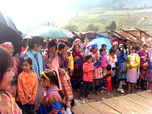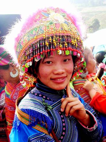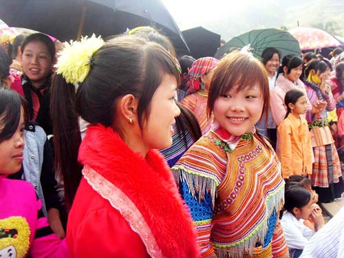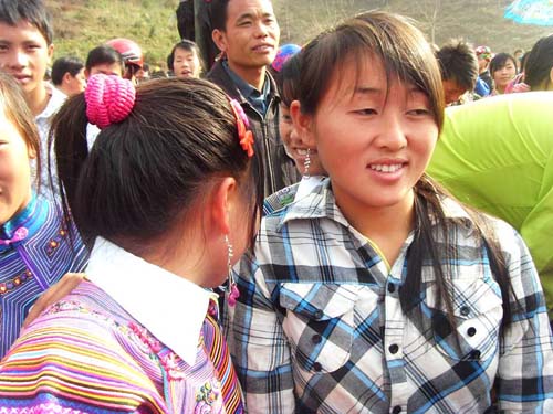 ![]() Trong đám đông, các thiếu nữ Mông nổi bật bởi bộ trang phục của mình |